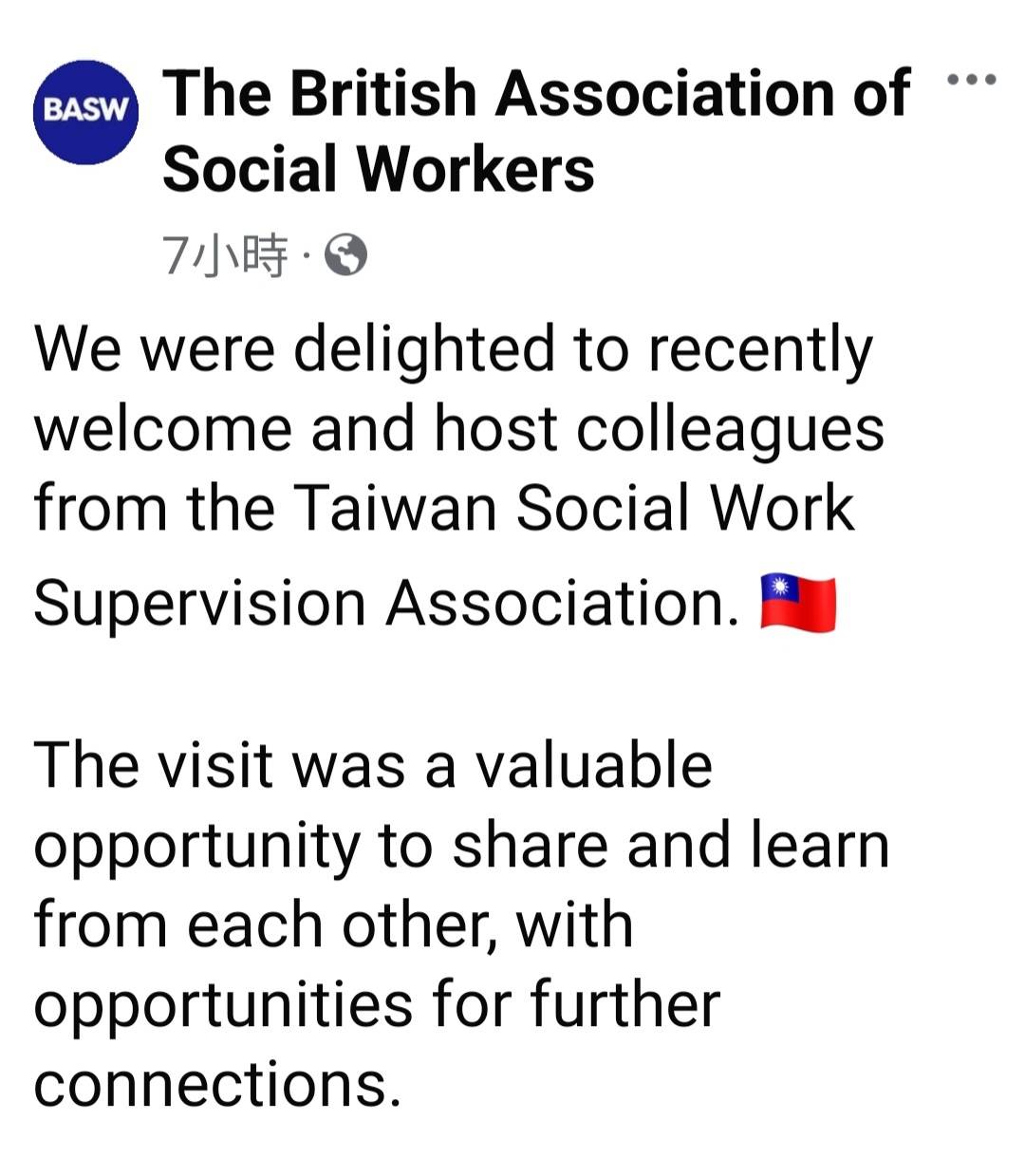 分享英國社會工作者協會(BASW)與台灣社會工作督導服務協會今年8月研討交流的報導~BASW官網特別提到提到台灣的社工專業歷史與發展。 https://basw.co.uk/articles/basw-welcomes-taiwan-social-work-supervision-association BASW的臉書刊登該報導時,更標示了中華民國國旗! https://www.facebook.com/share/p/9SZ6BExvWB5ppFZp/?mibextid=oFDknk